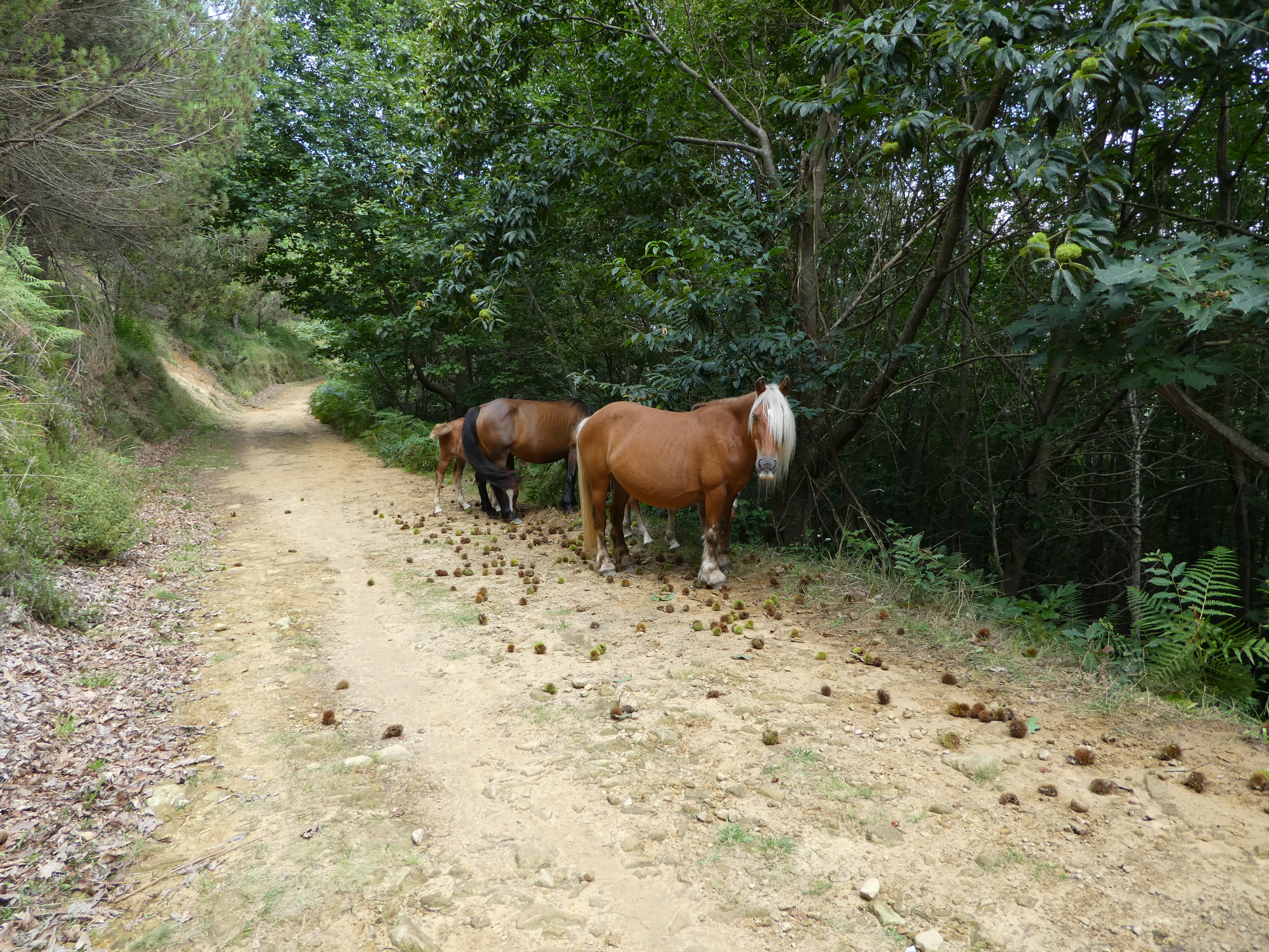 Once on the ridge, it's relatively smooth. I see lots of chestnuts on the ground. And far away, I see some things that are moving... They are horses! Not sure if they are wild horses, but I don't see any human around... Anyway, they don't seem to mind me, on the trail, munching on chestnuts...